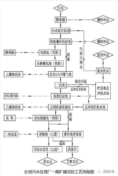 為達(dá)到環(huán)保部門要求的水質(zhì),長崗污水處理廠尾水進(jìn)行了提標(biāo)改造,具體工藝如下: